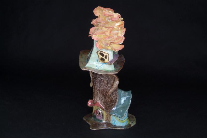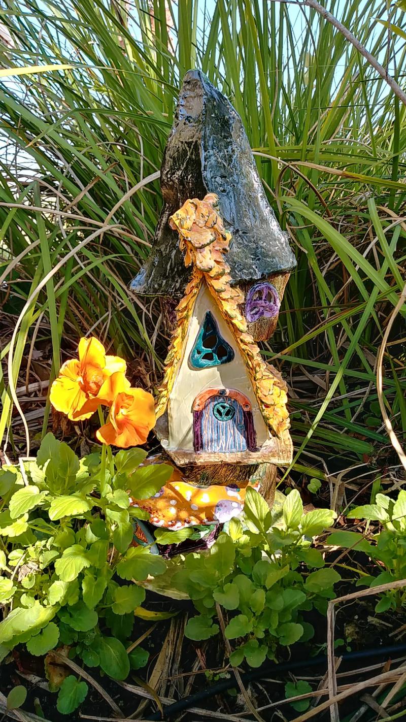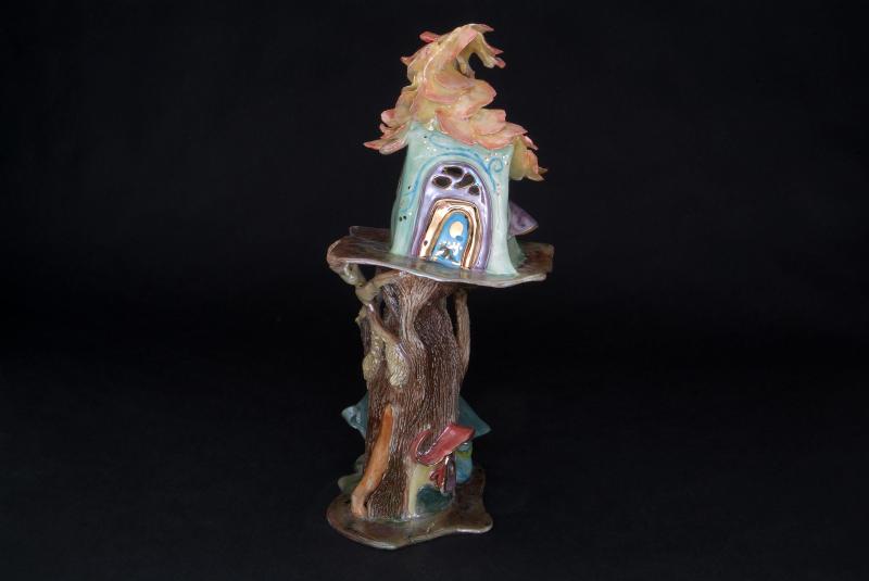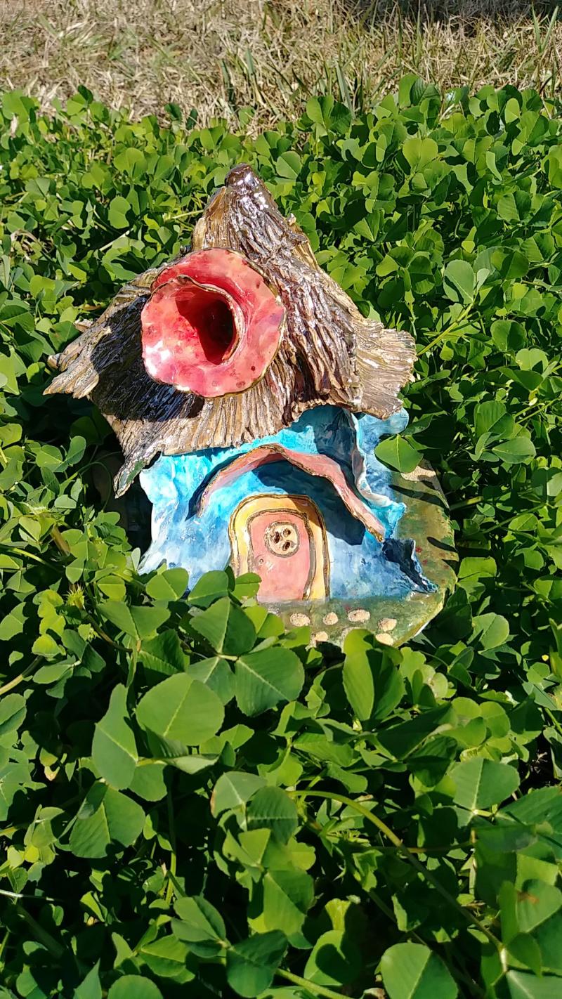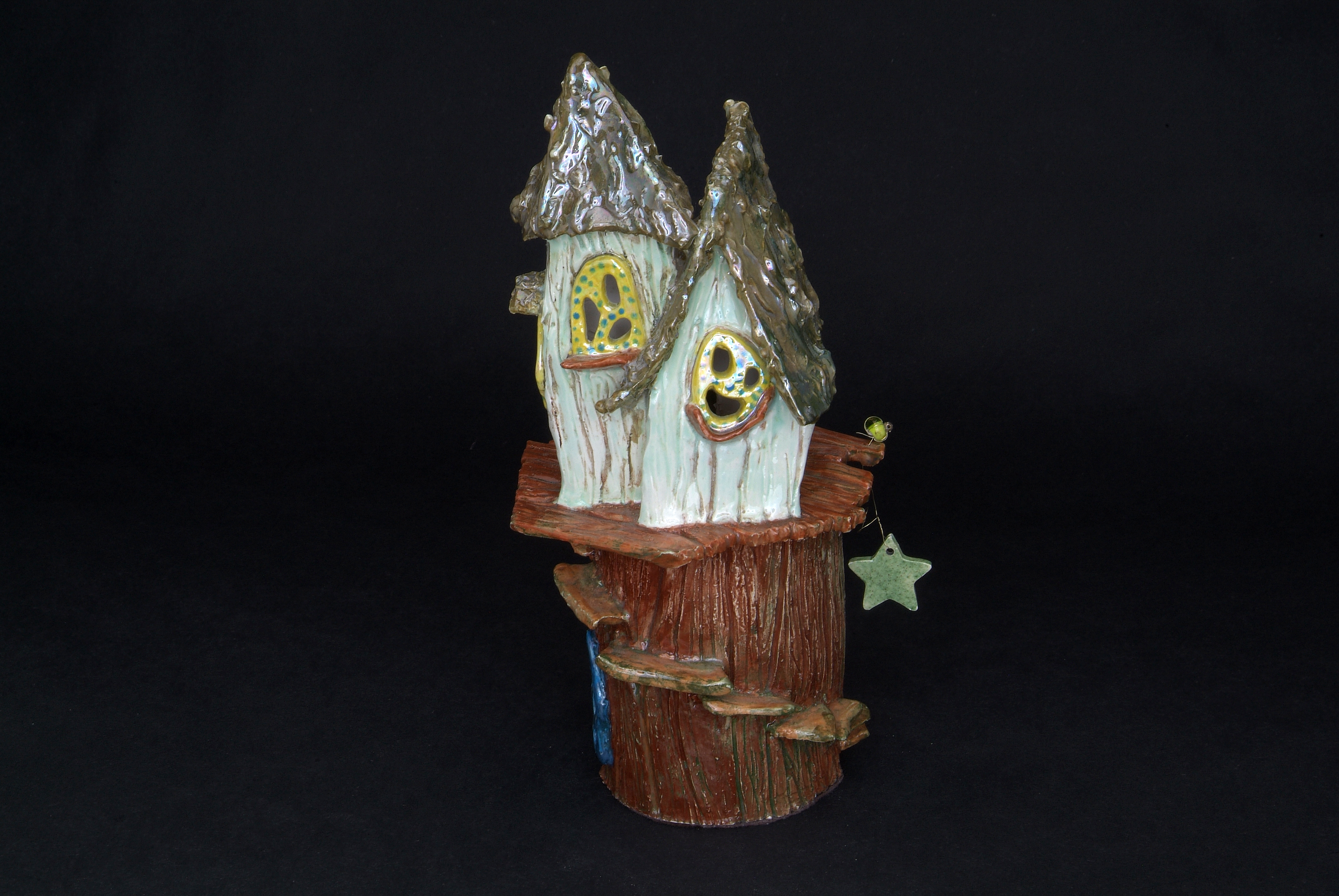 This delightful hollowed out log is perfect for a woodland nimp. Hand made from slabs of clay with knoted branches. House comes complete with windows and a decorated entry with a blue door.
