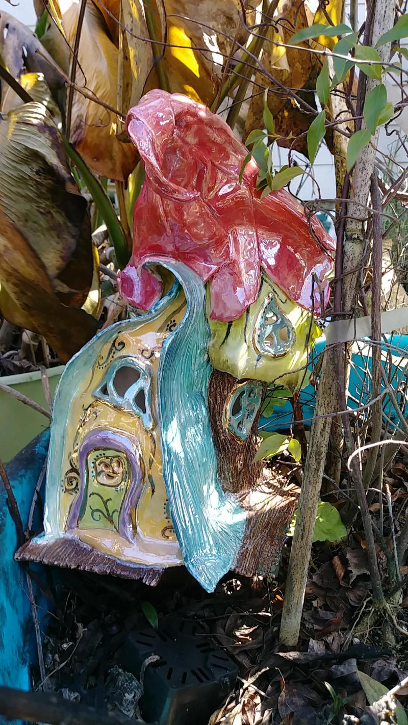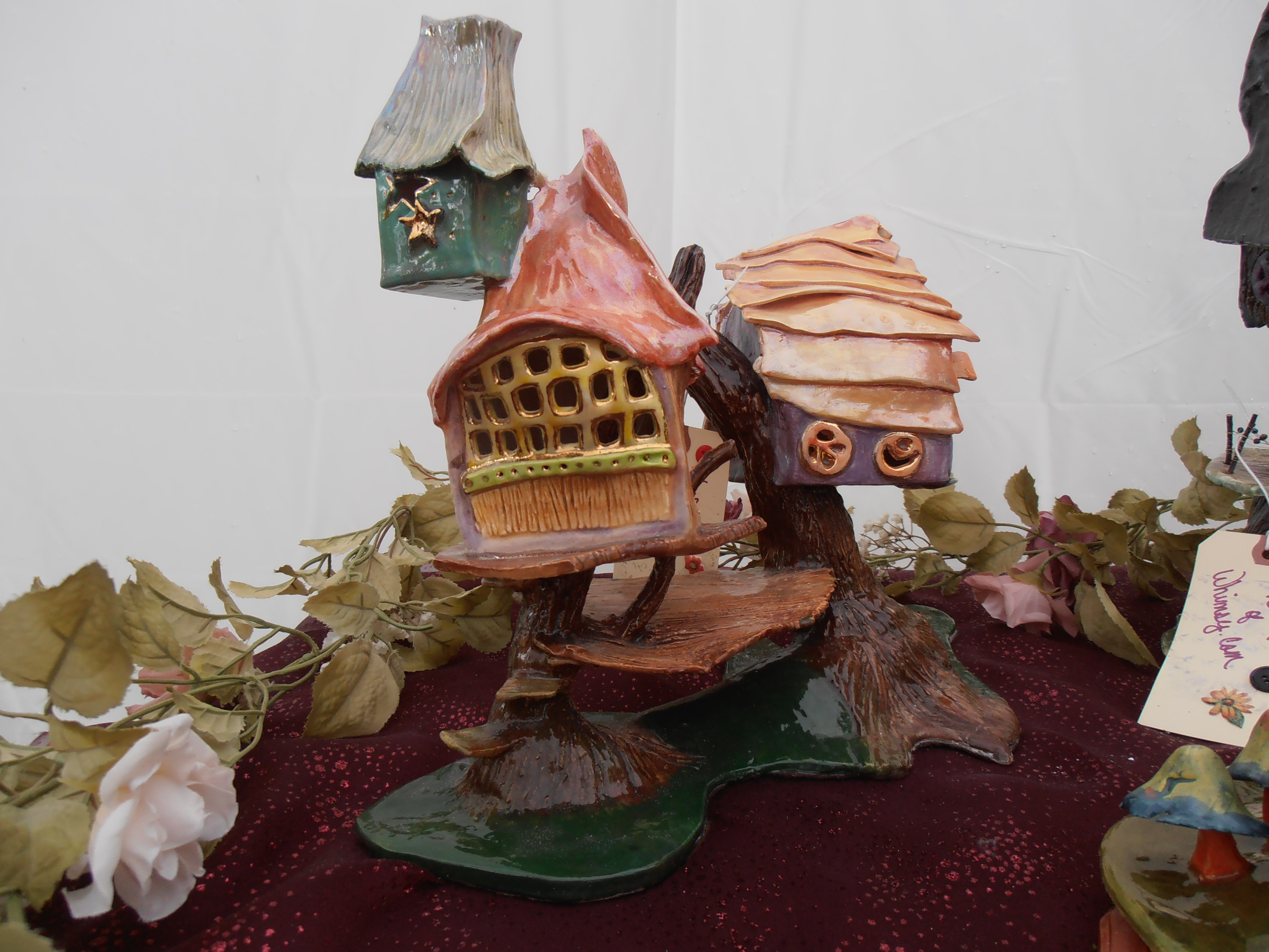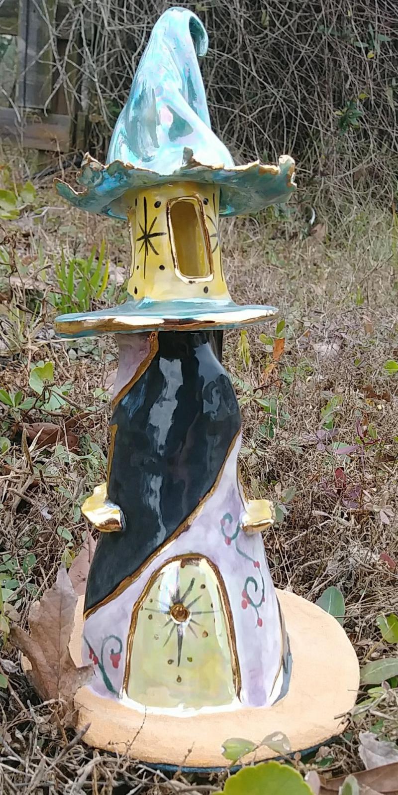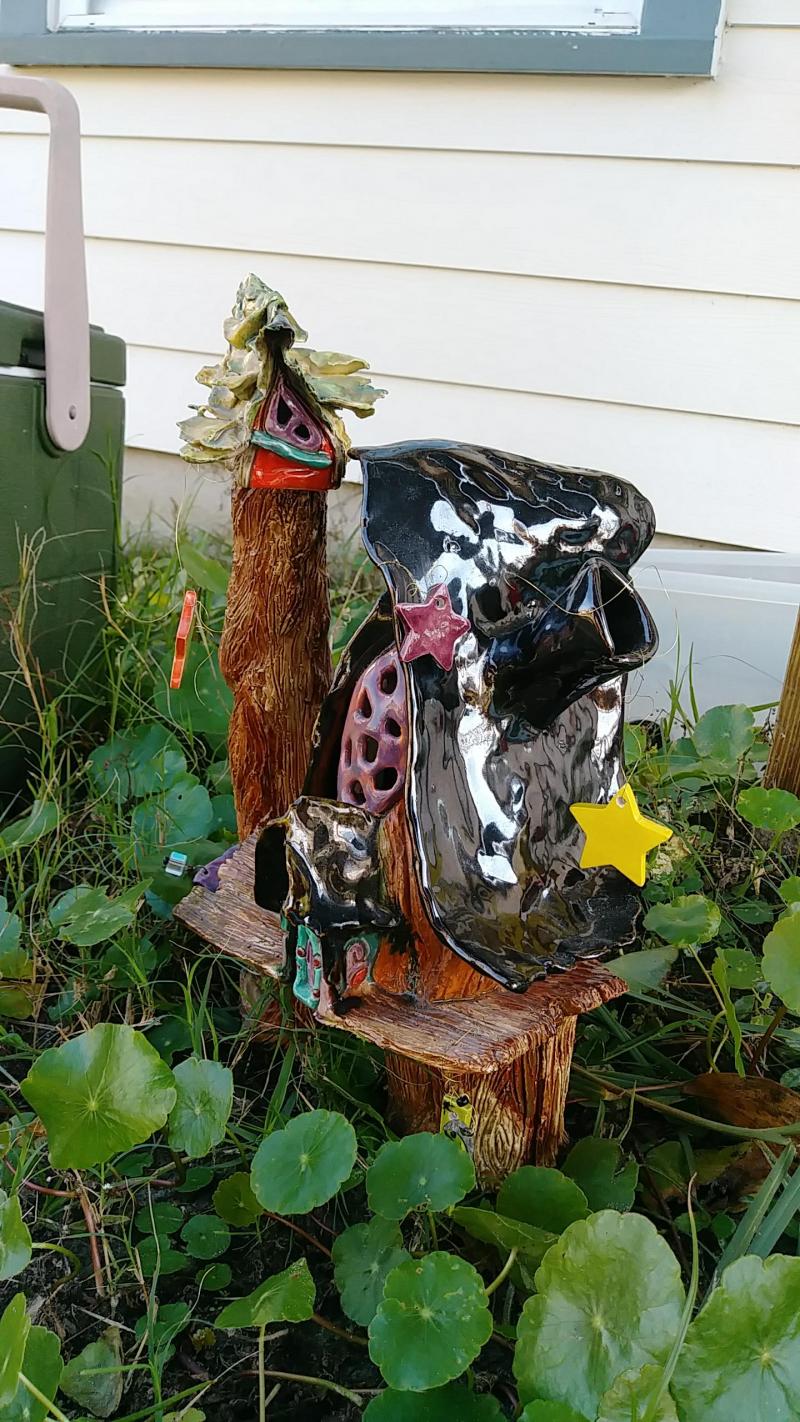 This delightful hollowed out log is perfect for a woodland nimp. Hand made from slabs of clay with knoted branches. House comes complete with windows and a decorated entry with a blue door.