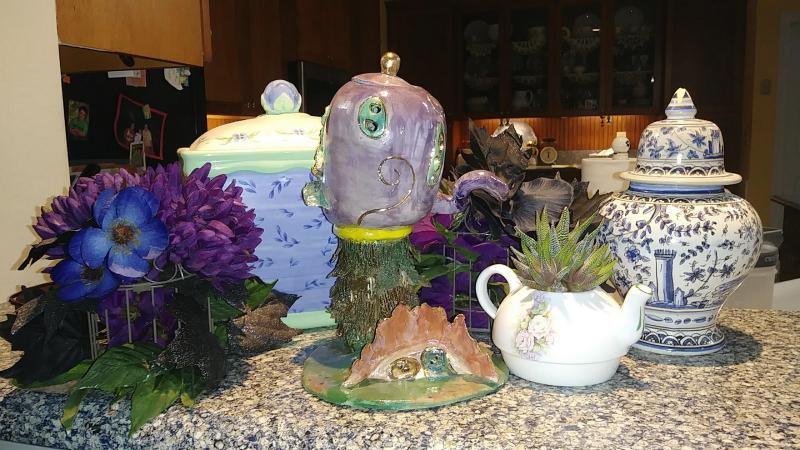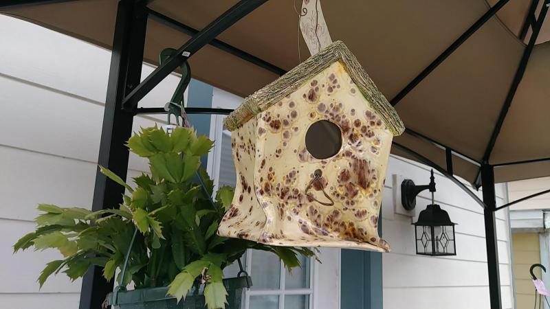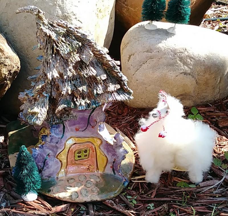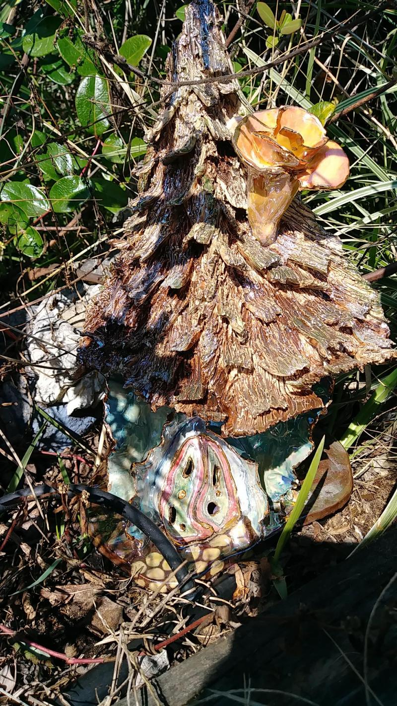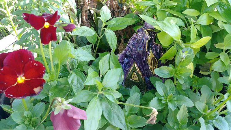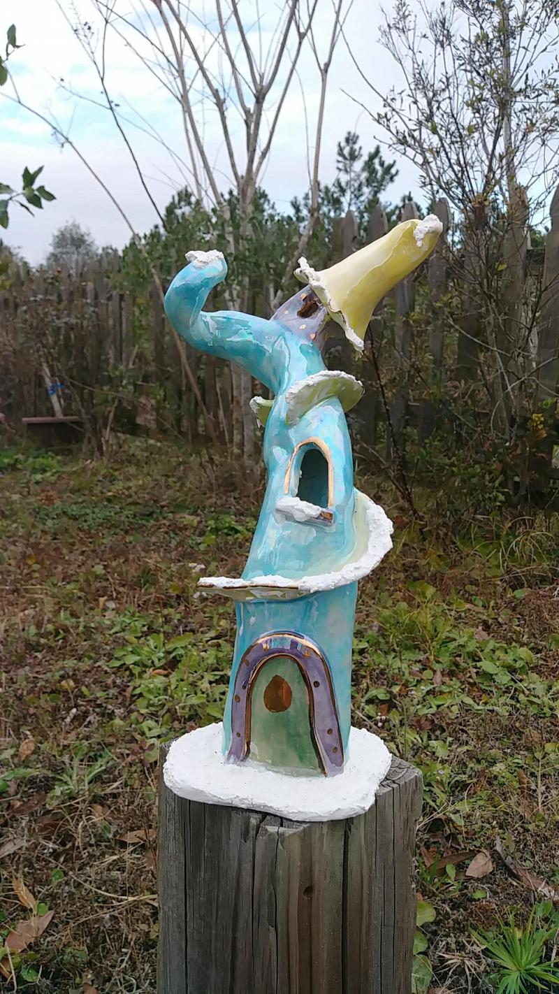 This delightful hollowed out log is perfect for a woodland nimp. Hand made from slabs of clay with knoted branches. House comes complete with windows and a decorated entry with a blue door.